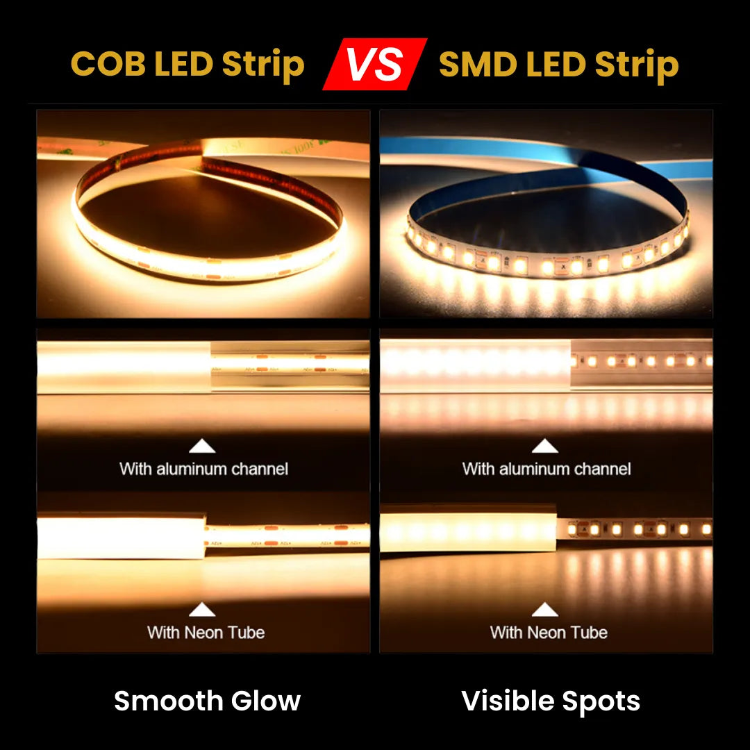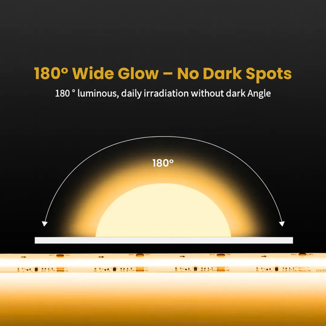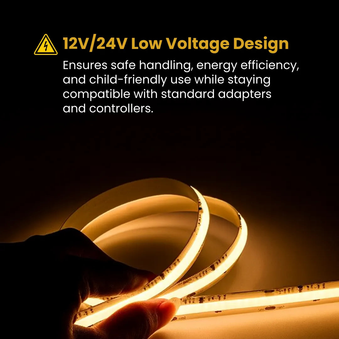 Designed with COB (Chip-on-Board) technology, this ultra-slim 8mm LED strip ensures smooth and uniform brightness, making it ideal for both home décor and commercial lighting applications.
