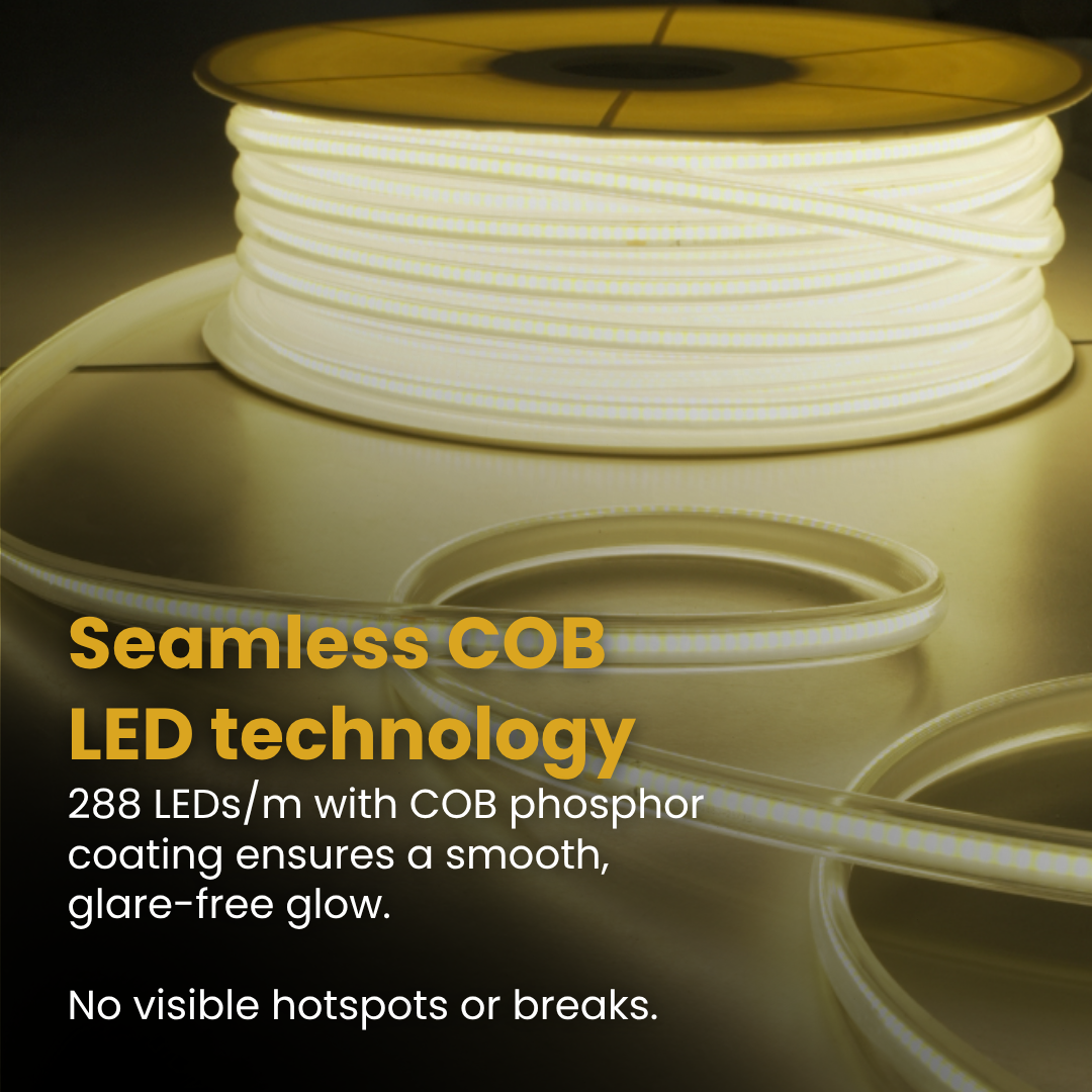 - 288 LEDs per meter with a phosphor COB cover ensure soft, even lighting without glare.