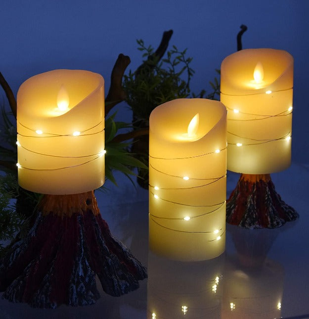 ✔ These candles combine a realistic LED flame with copper wire fairy lights, offering a unique dual glow effect for enhanced ambiance.