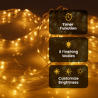 1.The fairy light has a timer function, all lighting modes are working under the timer mode (6 hours on and 18 hours off)