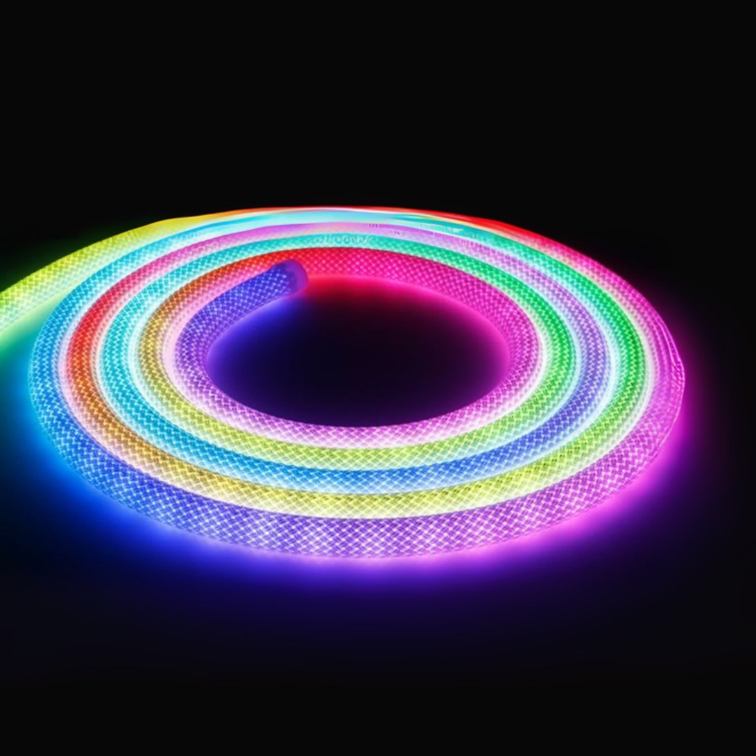 This flexible neon woven rope is cuttable at specific intervals and compatible with popular pixel controllers like SP105E, SP108E, SP501E, T1000S, and more (sold separately).