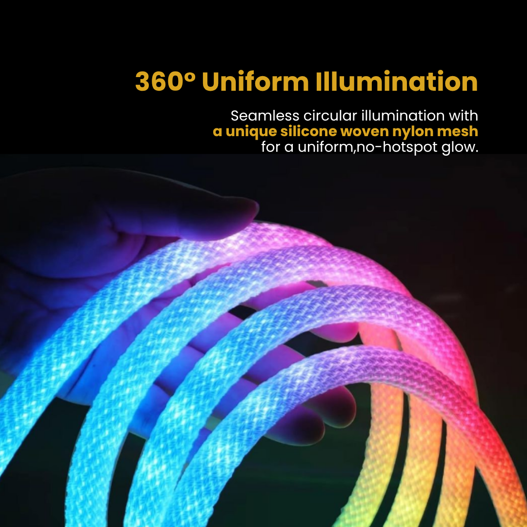 Experience stunning 360-degree illumination with a unique reticulate mesh fabric combining silicone and woven nylon—for a flexible neon tube feel and uniform glow without hotspots.