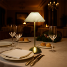 Bring timeless elegance to any setting with the Velora Table Lamp, a refined blend of vintage charm and modern cordless convenience. Featuring a beautifully pleated fabric shade and a brushed brass metal base, this rechargeable LED lamp is perfect for upscale dining, bedrooms, lounges, and special events—anywhere you want sophisticated lighting without cords.