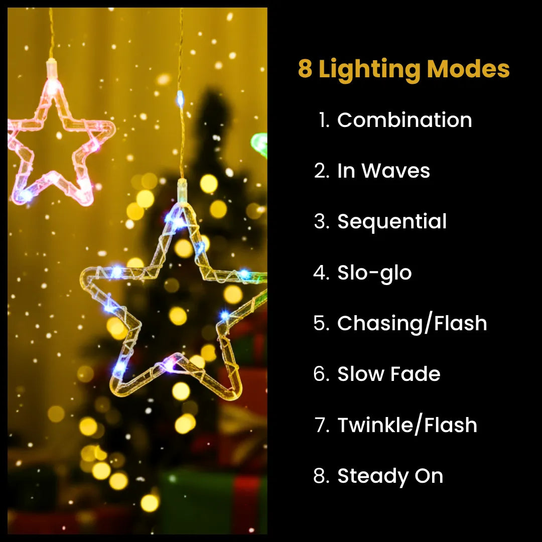 These gorgeous lights feature LED SMD technology, offering brighter illumination and energy efficiency compared to traditional LEDs. With 8 lighting modes, these Star Curtain Lights are perfect for setting the ideal mood for the festive season, creating a warm, inviting atmosphere. Ideal for both indoor and outdoor décor, these lights blend tradition and modernity beautifully.