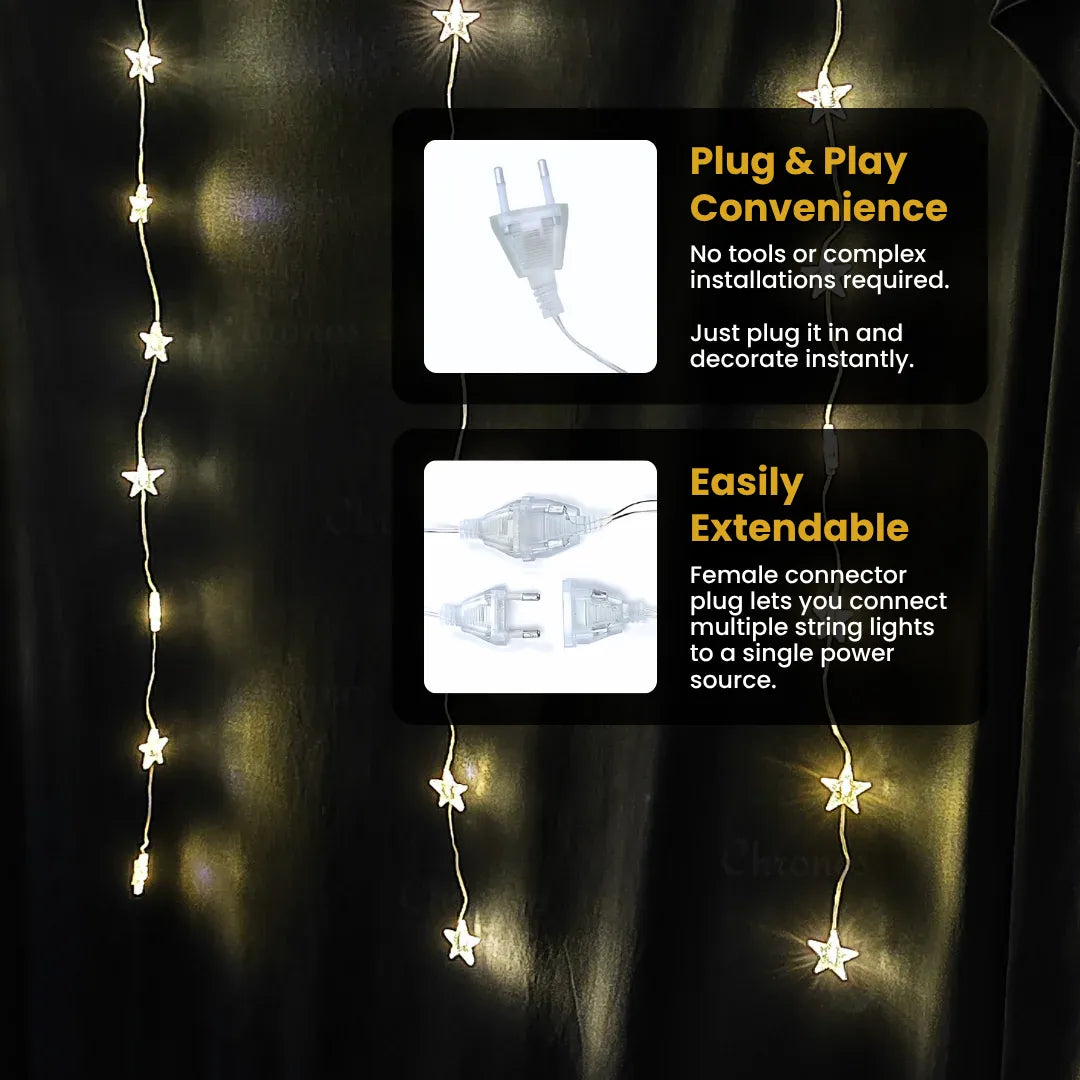 String lights are small LED bulbs connected along a flexible wire, perfect for decorating trees, windows, walls, and outdoor spaces with a warm, festive glow.