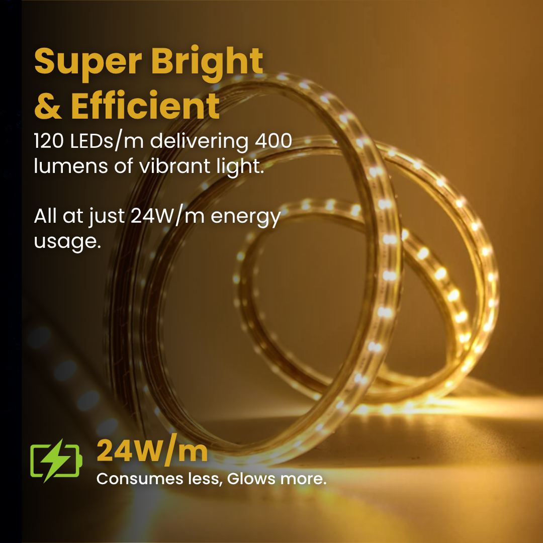 - Equipped with 120 LEDs per meter, delivering up to 400 lumens/m for bright, uniform lighting.