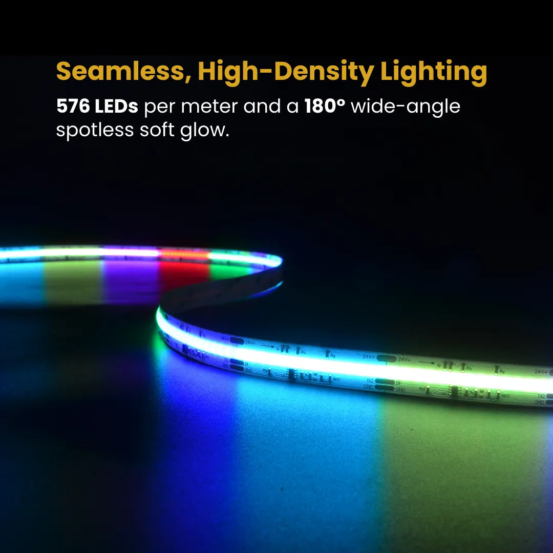 High-Density LED Strip: Packed with 576 LEDs per meter and a 180° wide-angle glow, this strip ensures smooth, bright, and uniform lighting for any setting.