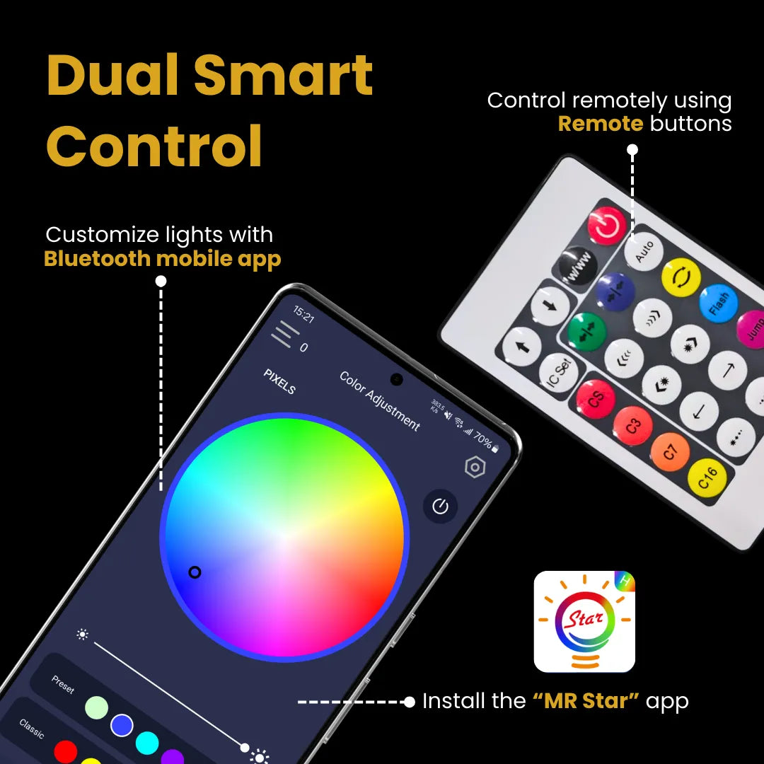 RGBIC Technology: Control colors and effects with precision using 80 addressable ICs, enabling dynamic effects like rainbow, starburst, and more.
