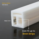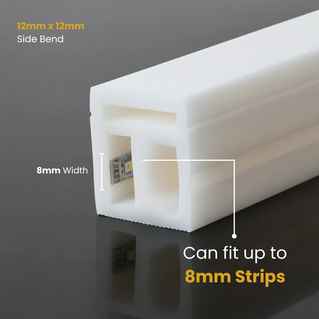 The 12mm x 12mm silicone LED profile is designed to fit side-emitting LED strips up to 8mm in width. It’s compatible with most standard side light LED strips and offers a snug, secure fit for optimal light output.
