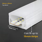 The 30mm x 20mm Silicone LED Profile fits LED strips up to 15mm wide. Suitable strips include: