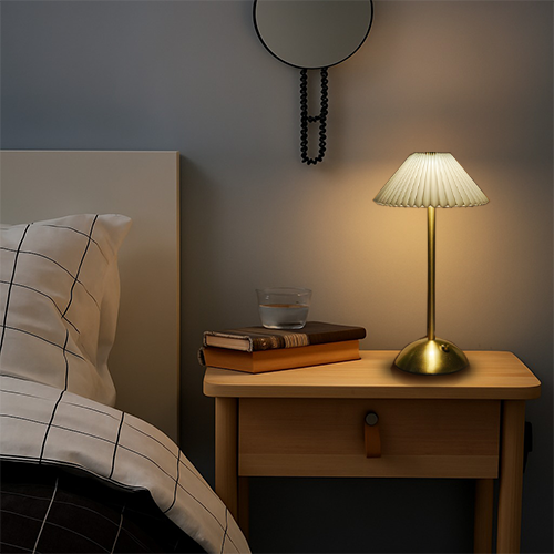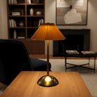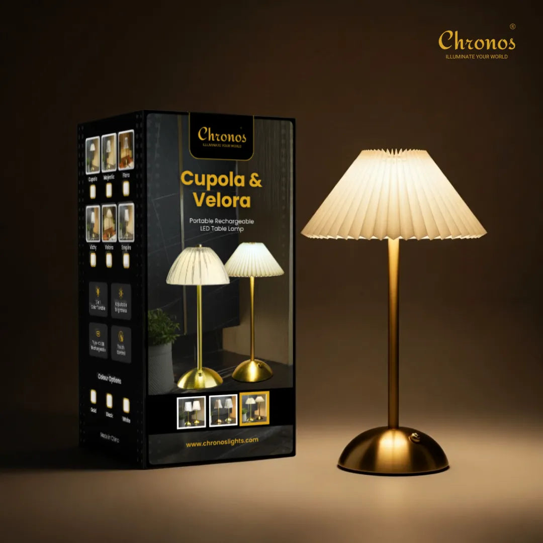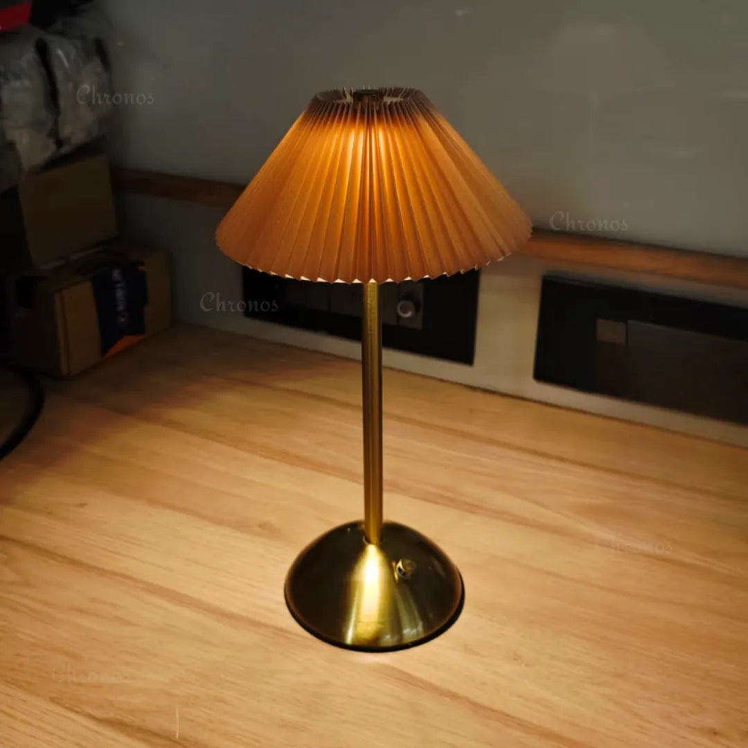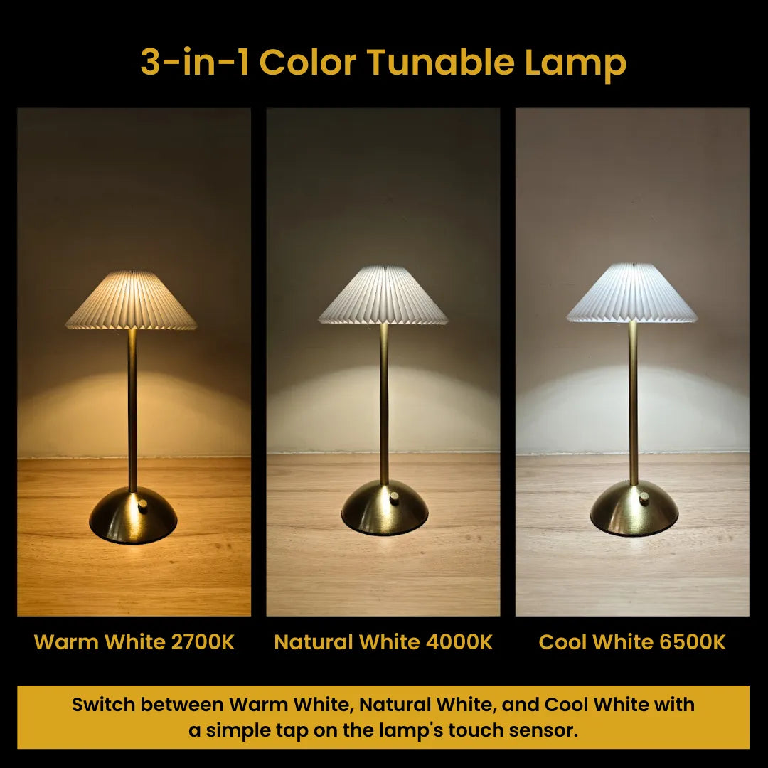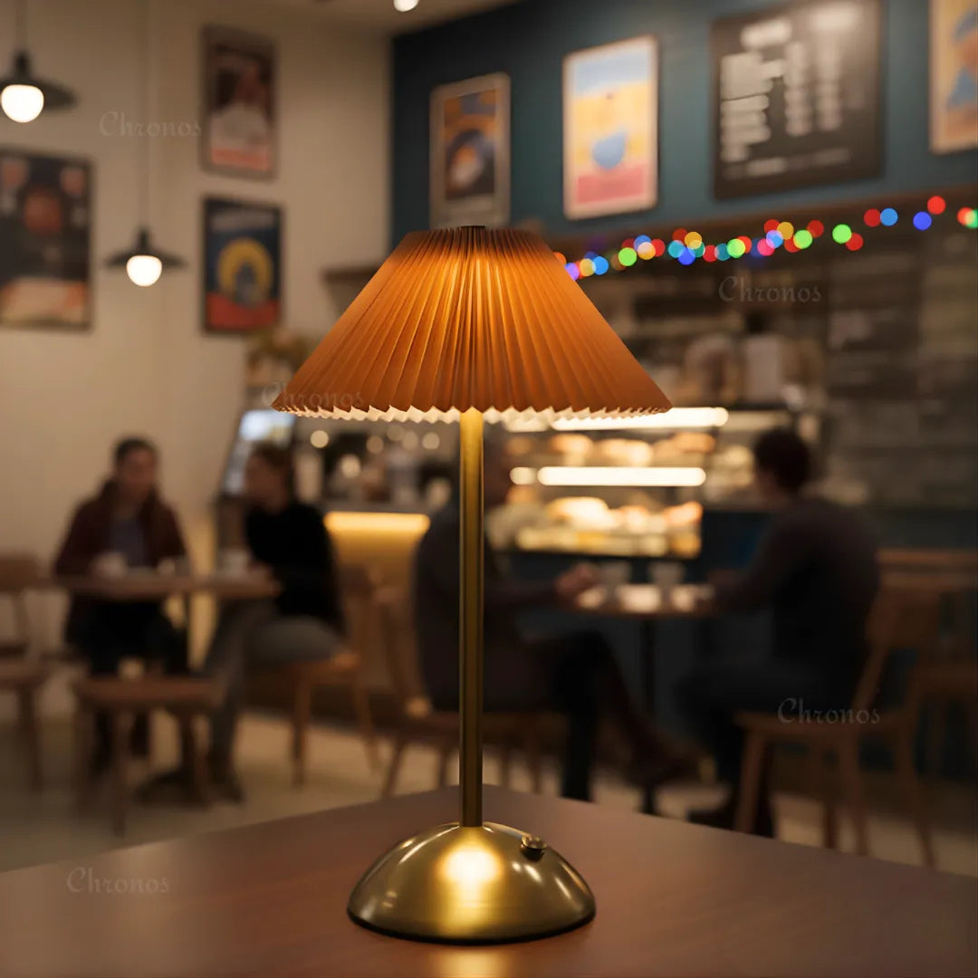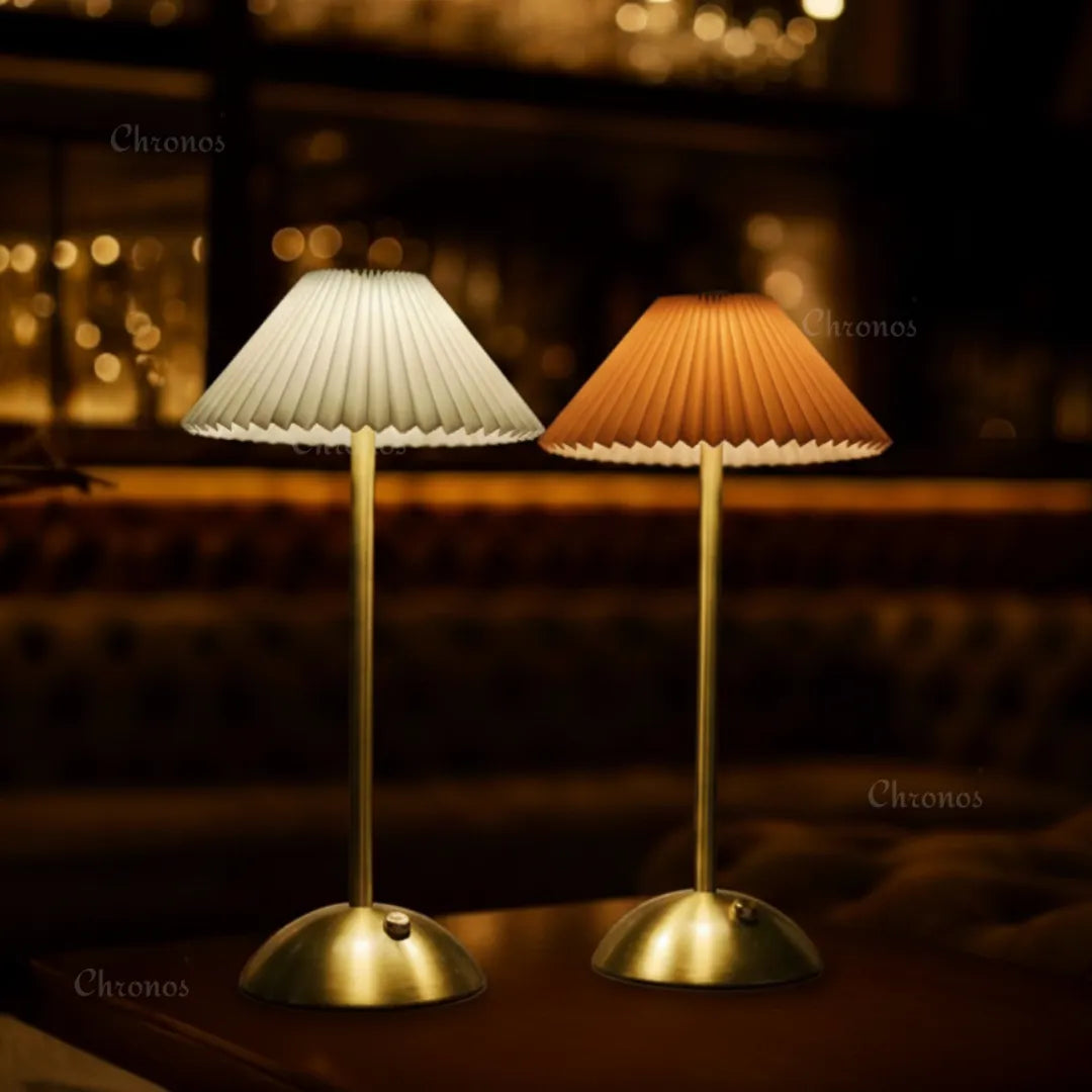 Bring timeless elegance to any setting with the Velora Table Lamp, a refined blend of vintage charm and modern cordless convenience. Featuring a beautifully pleated fabric shade and a brushed brass metal base, this rechargeable LED lamp is perfect for upscale dining, bedrooms, lounges, and special events—anywhere you want sophisticated lighting without cords.